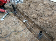 В траншею укладываем арматурную сетку, приварив её к только что вкрученным сваям.