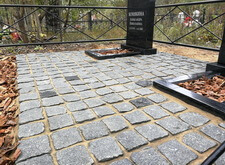 После создания основания мы покрыли территорию места захоронения гранитной брусчаткой, параллельно с этим установив заранее изготовленные памятники и цветники. Затем вернули на место металлическое ограждение и засыпали цветники и площадь перед брусчаткой корой. Этап работ на снимках не отображён, однако на приведённых ниже фото отлично виден итоговый результат.