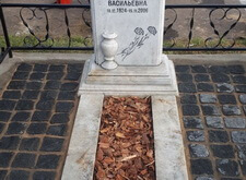 Внутрь бетонного цоколя кладём брусчатку, красим оградку, наполняем цветник корой, надписи на памятнике покрываем чёрным акрилом. Обычно мы кладём наземное покрытие так, чтобы бетонного цоколя не было видно, однако, в данном случае клиент не пожелал переустанавливать ограждение и проводить какие-либо дополнительные работы, так что брусчатка была уложена вовнутрь. Состояние места захоронения после проведения работ представлено на нижеприведённых фото.